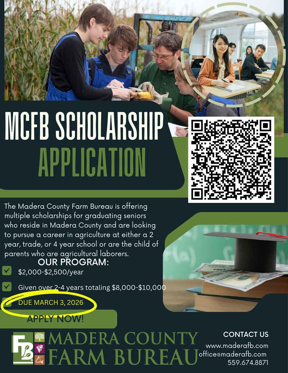 The Madera County Farm Bureau sponsors scholarship open to students who are enrolled in a degree program at an accredited university.